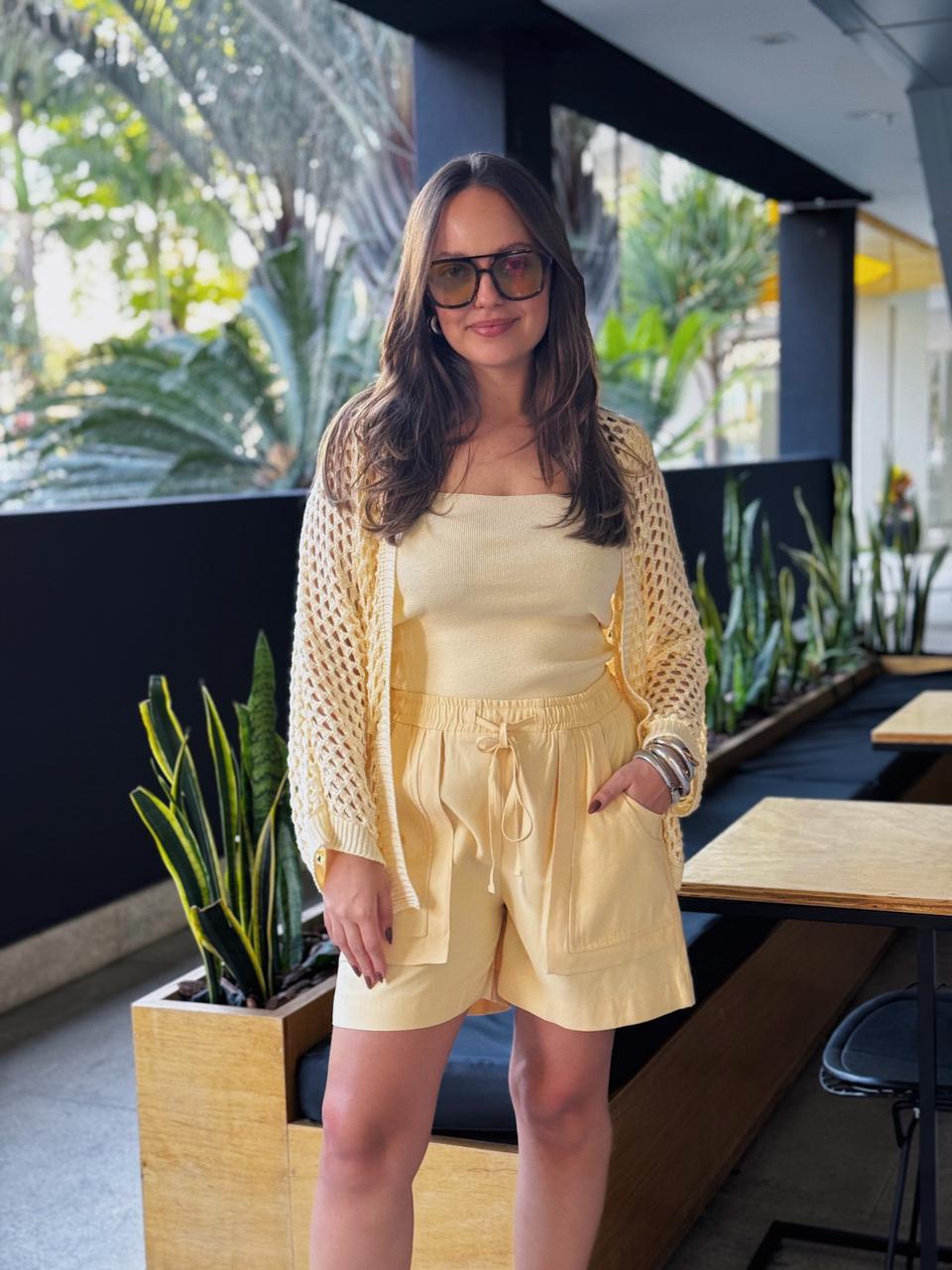 O shorts é confeccionado em tecido leve. A peça solta ao corpo possui cintura alta, cós com elástico embutido,cordão para ajuste, bolsos frontais, recortes frontais e acabamento pespontado.