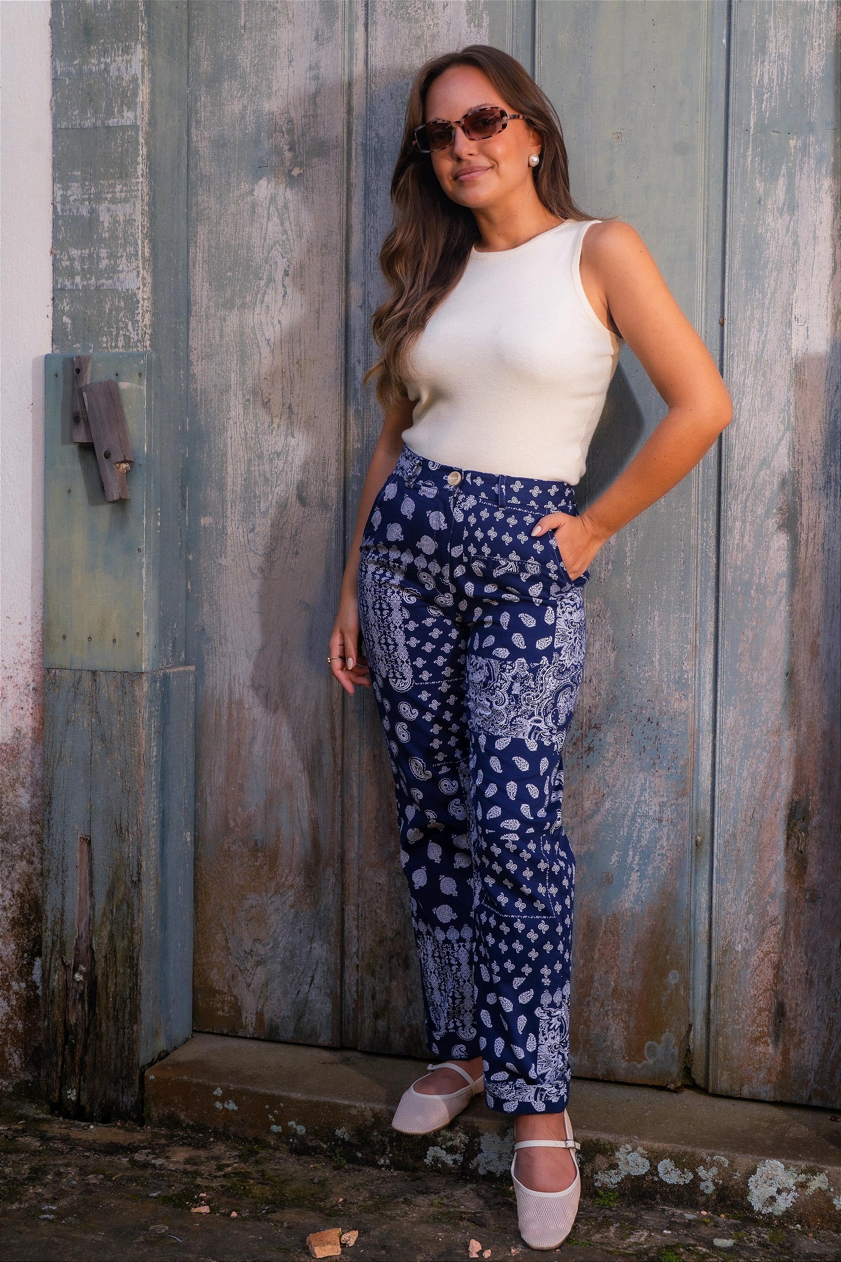 A calça feita na sarja. A peça solta ao coporto possui cintura alta, cós com passantes, bolsos frontais modelo faca, pences posteriores, barra estendida, comprimento longo, fechamento frontal por ziper e botão.
