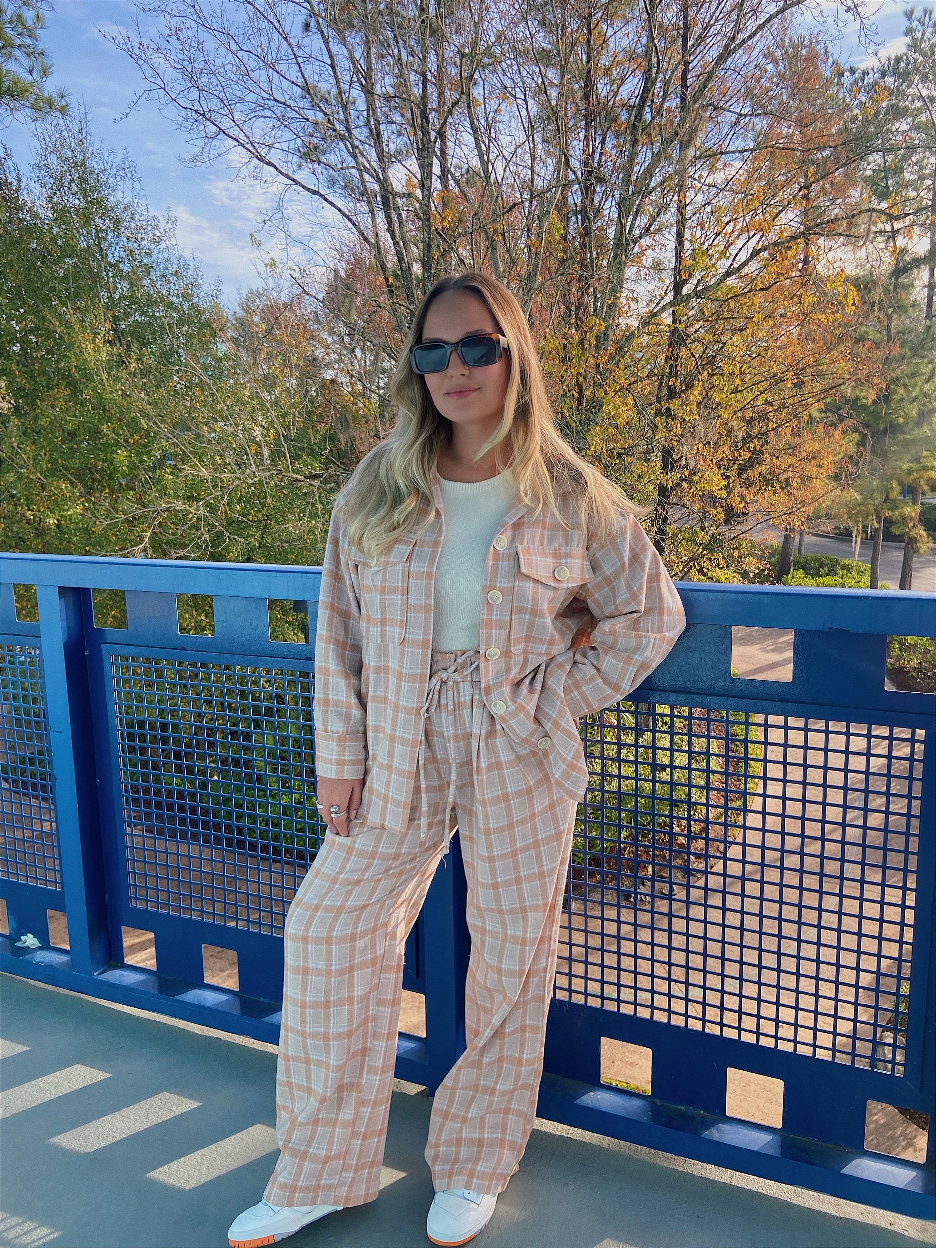 A calça é confeccionada na flanela. A peça possui cintura alta, cós com elástico e passante embutido para ajuste, bolsos frontais, comprimento longo, shape solto, caimento reto e acabamento prespontado.