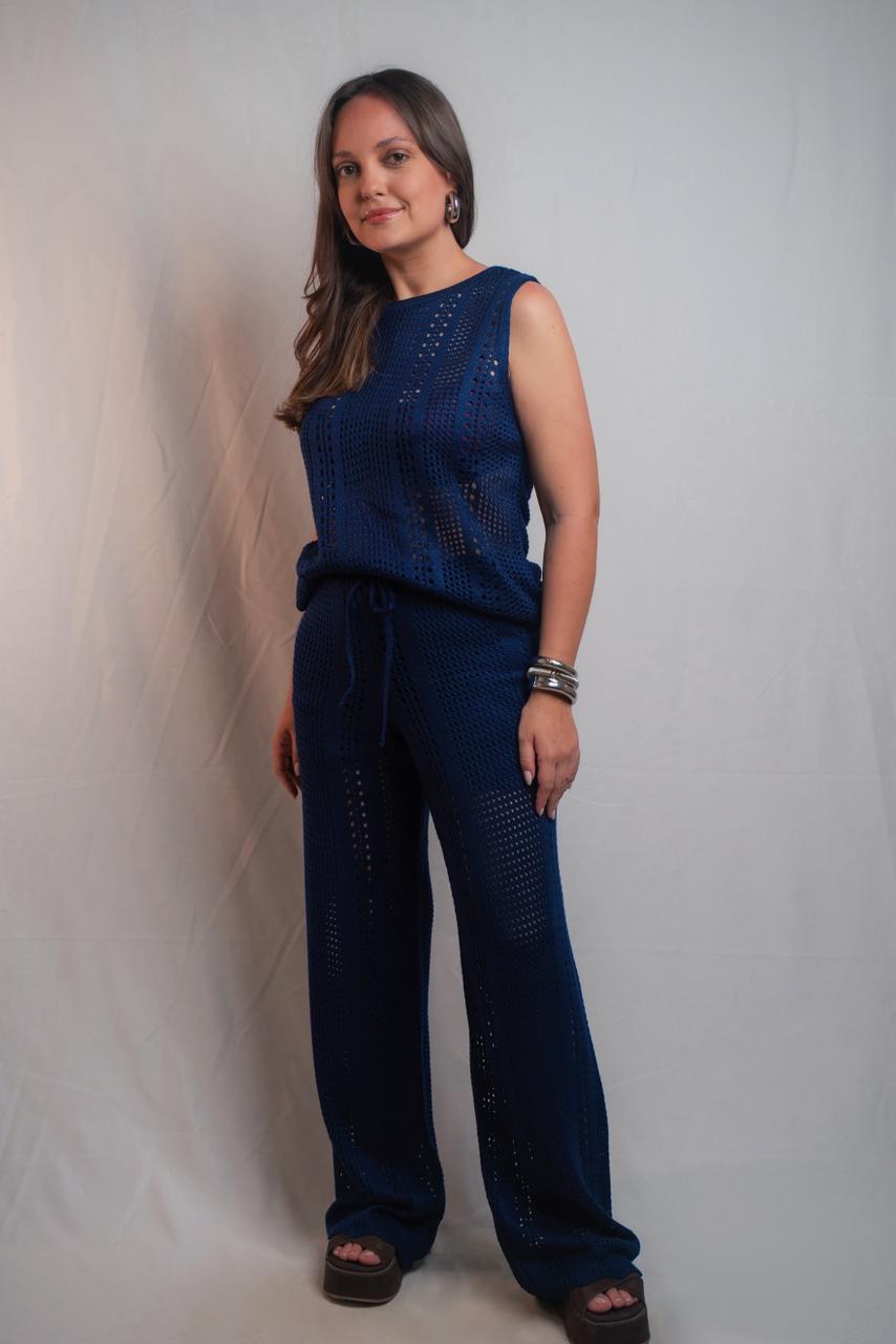 A calça Francesca é confeccionada em tricot. A peça solta ao corpo possui cintura alta, cós com tira alongada embutida para ajuste e amarração frontal, trama com recortes vazados e forro curto.