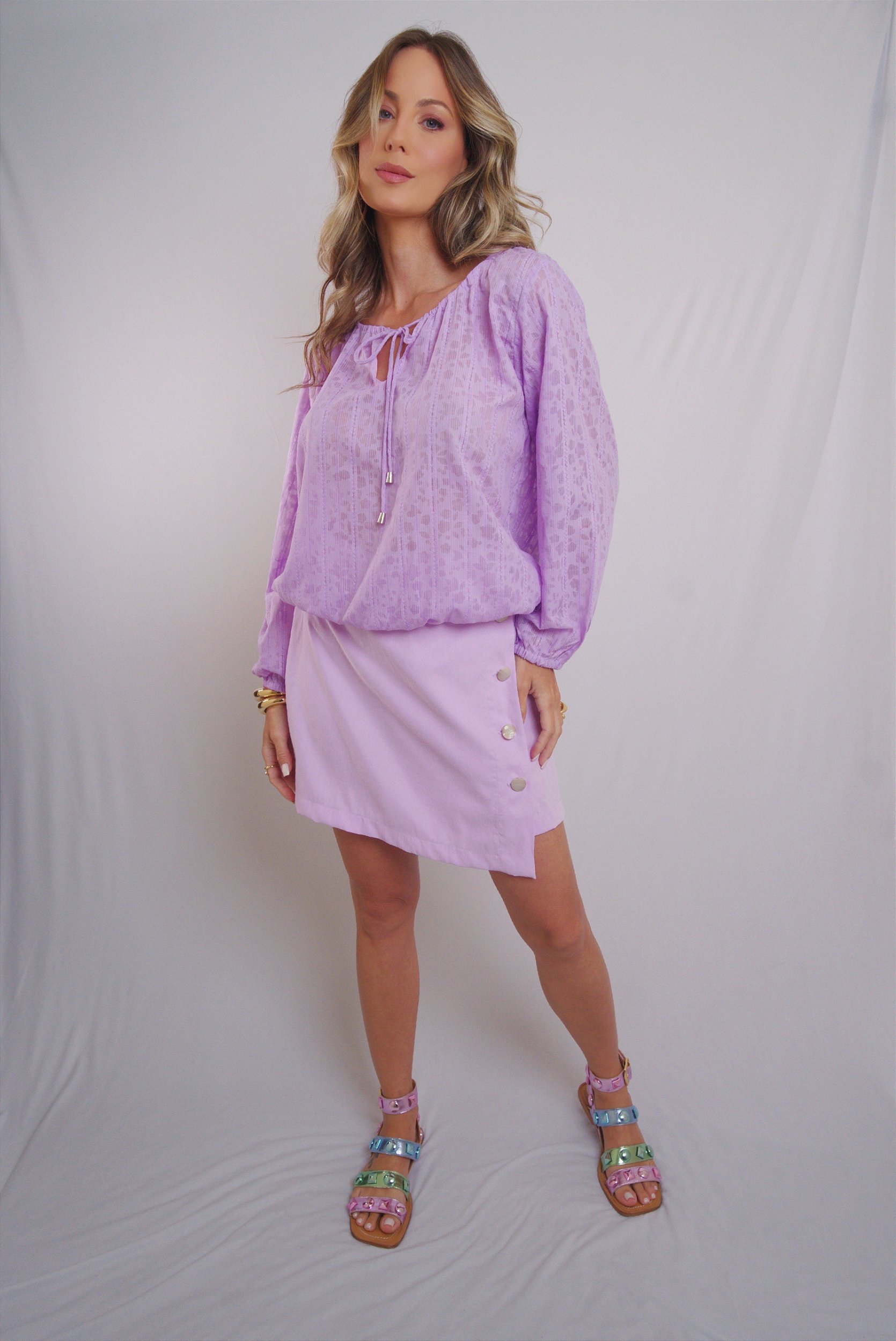 A saia é confeccionada em tecido leve. A peça possui cintura alta, barra assimétrica, comprimento curto, shape solto, fechamento frontal por botões e acabamento prespontado.