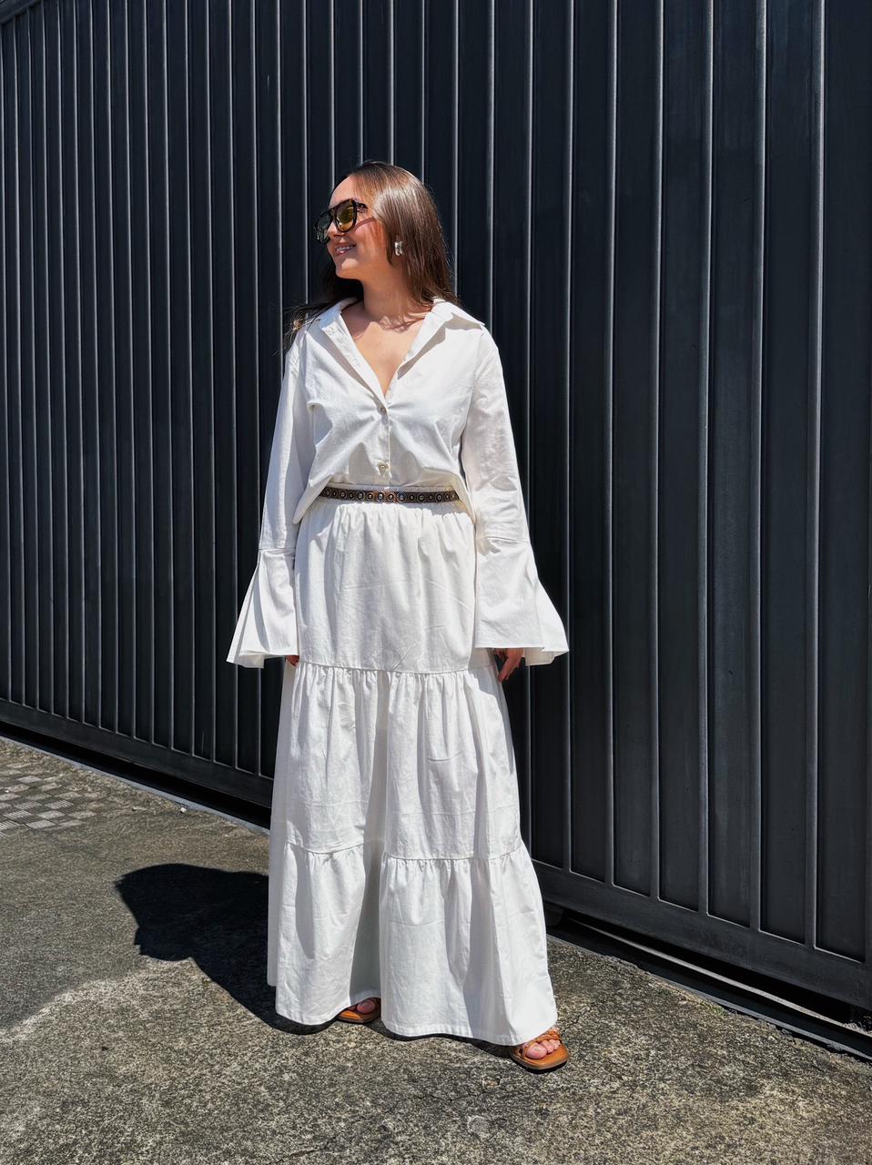 A saia é confeccionada no tricoline. A peça solta ao corpo possui cintura alta, cós com elástico embutido, forro curto, recortes e comprimento midi longo.