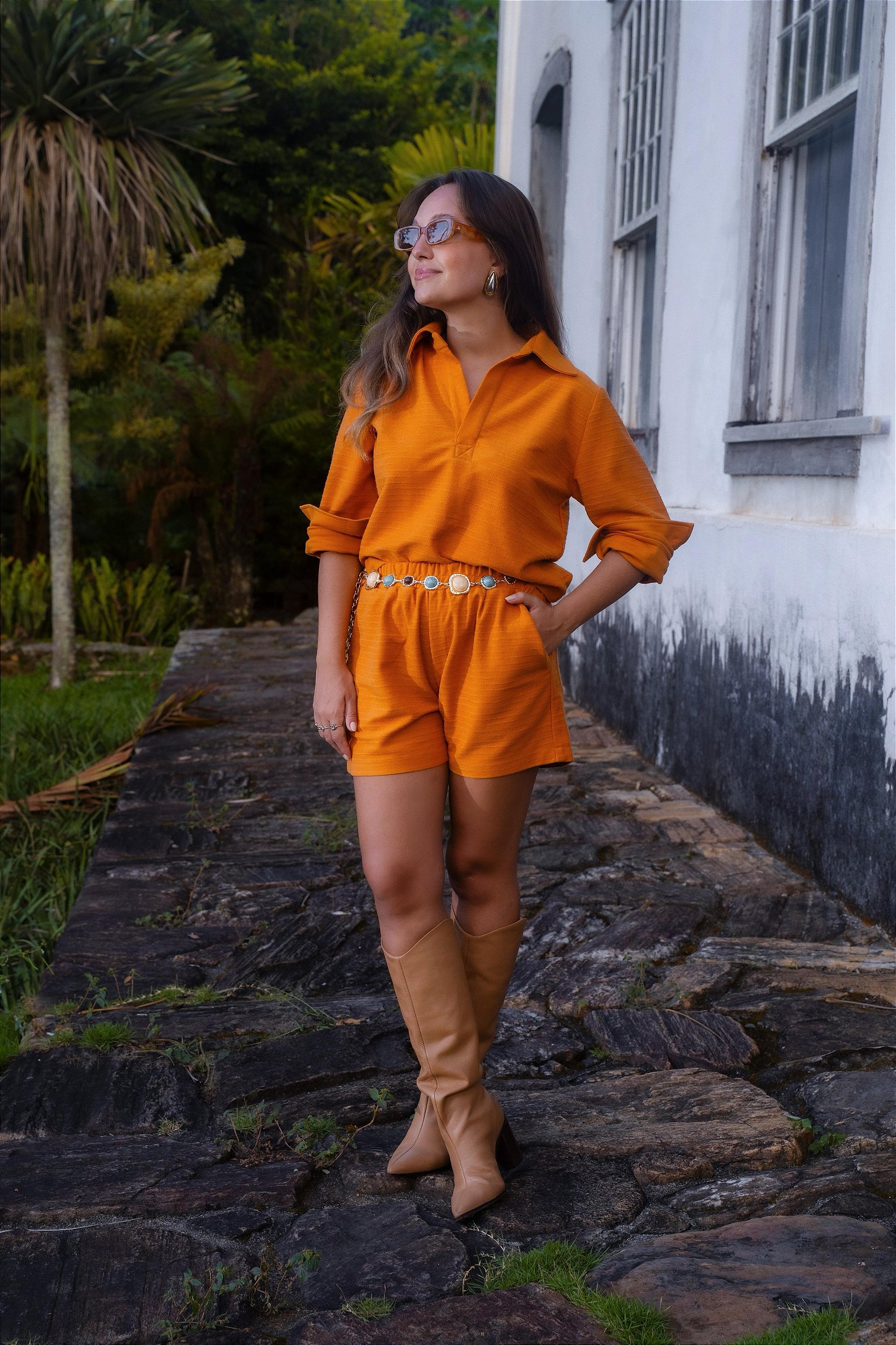 Shorts modelo boxer possui cintura alta, cós com elástico embutido, bolsos nas laterais e comprimento curto.
