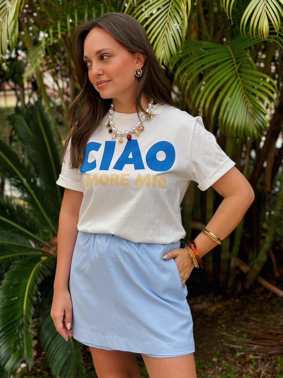A camiseta Martina é confeccionada na malha de algodão. A peça solta ao corpo possui decote redondo com acabamento canelado, mangas curtas, estampa frontal e comprimento alongado.